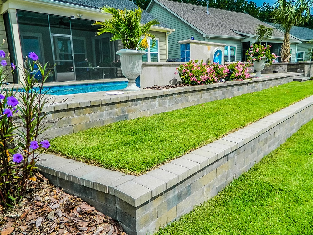 Through the use of a large variety of paver colors, paver shapes, paver styles and laying patterns, our team can work with you to create a one-of-a-kind paver retaining wall design. The versatility of pavers also allows paver retaining walls to be used both functionally as well as complementary in your overall landscape design. Ask us about our Lowcountry traditional colors and paver styles and shapes inspired by our South Carolina Lowcountry cities and coast.